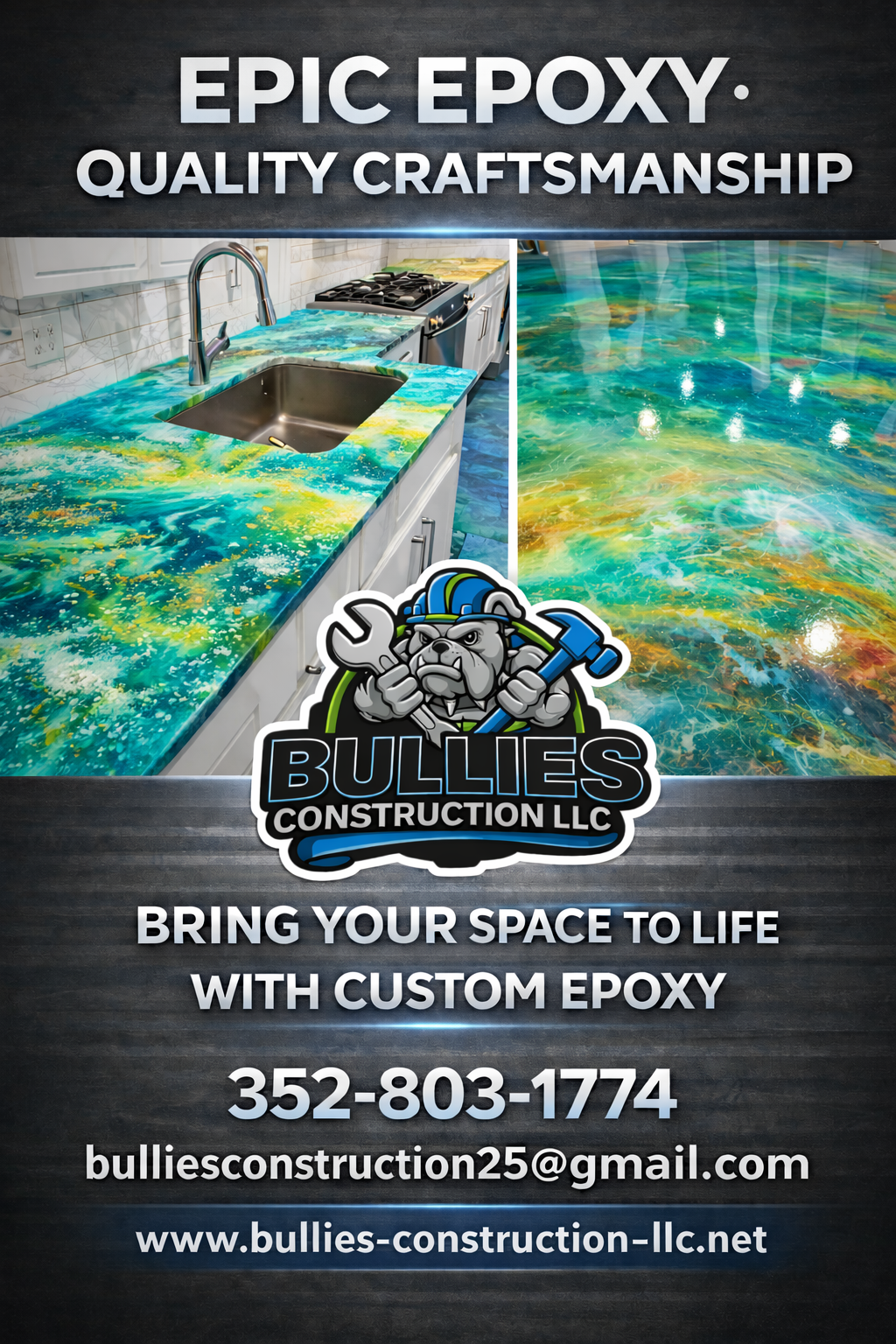 At Bullies Construction LLC, every project is an opportunity to build something exceptional. We specialize in commercial and residential work including new builds, full renovations, custom carpentry, drywall installation, and finish work. We also provide epoxy countertops, backsplashes, and flooring for durable, modern finishes. Our team is committed to quality craftsmanship, clear communication, and bringing each client’s vision to life from start to completion. Built with integrity, precision, and pride!!!